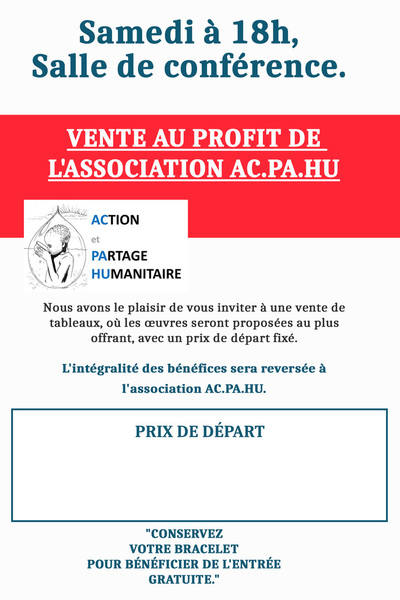 SAMEDI 10 et SAMEDI 17 DECEMBRE le matin : vente de brédélés et de soupe étoilée sur le marché de Benfeld - SAMEDI 3 DECEMBRE deux stands Vente d'artisanat et brédélés dans un chalet au VILLAGE DU PARTAGE place Kléber à STRASBOURG à côté du sapin Vente d'artisanat et brédéles au Garage PEUGEOT à Sélestat SAMEDI 19 NOVEMBRE : Soirée Malgache en collaboration avec le GESCOD et la CCCEVENDREDI 11 et DIMANCHE 13 NOVEMBRE : élaboration de bredeles par les membres d'AC.PA.HU.SAMEDI 5 NOVEMBRE : Concert à l'église de Benfeld. Künigs-Art SAMEDI 15 et DIMANCHE 16 OCTOBRE : vente d'artisanat et tenue de la buvette et petite restauration aux Journées d'Octobre à Benfeld et réunion des membres le 15 SAMEDI 24 SEPTEMBRE : réunion des membres d'AC.PA.HU. à la Villa Jaeger à 17 h DIMANCHE 11 SEPTEMBRE : Participation à la Fête du Sport et des Associations à Benfeld SAMEDI 3 SEPTEMBRE : Partage au Fil de l'Eau - Etang de Pêche de Benfeld JEUDI 25 AOUT : rencontre avec Alfred PIGNAN de KABOLI au TOGO à la Villa Jaeger à 18 h 30 DIMANCHE 19 AOUT : Vente de livres lors de la Fête de Stubelhansel à Benfeld SAMEDI 6 AOUT : réunion des membres à la Villa Jaeger SAMEDI 11 JUIN : Stand d'artisanat africain à la Journée Africaine de l'ACASE à Sélestat SAMEDI 4 ET DIMANCHE 5 JUIN : Participation en qualité de bénévoles au Triathlon de Benfeld - Obernai JEUDI 26 MAI : Randonnée à définir SAMEDI 21 MAI : Réunion de notre association à la Villa Jaeger de Benfeld à 17 h JEUDI 8 MAI : Participation à la Fête des Fleurs de Hipsheim
